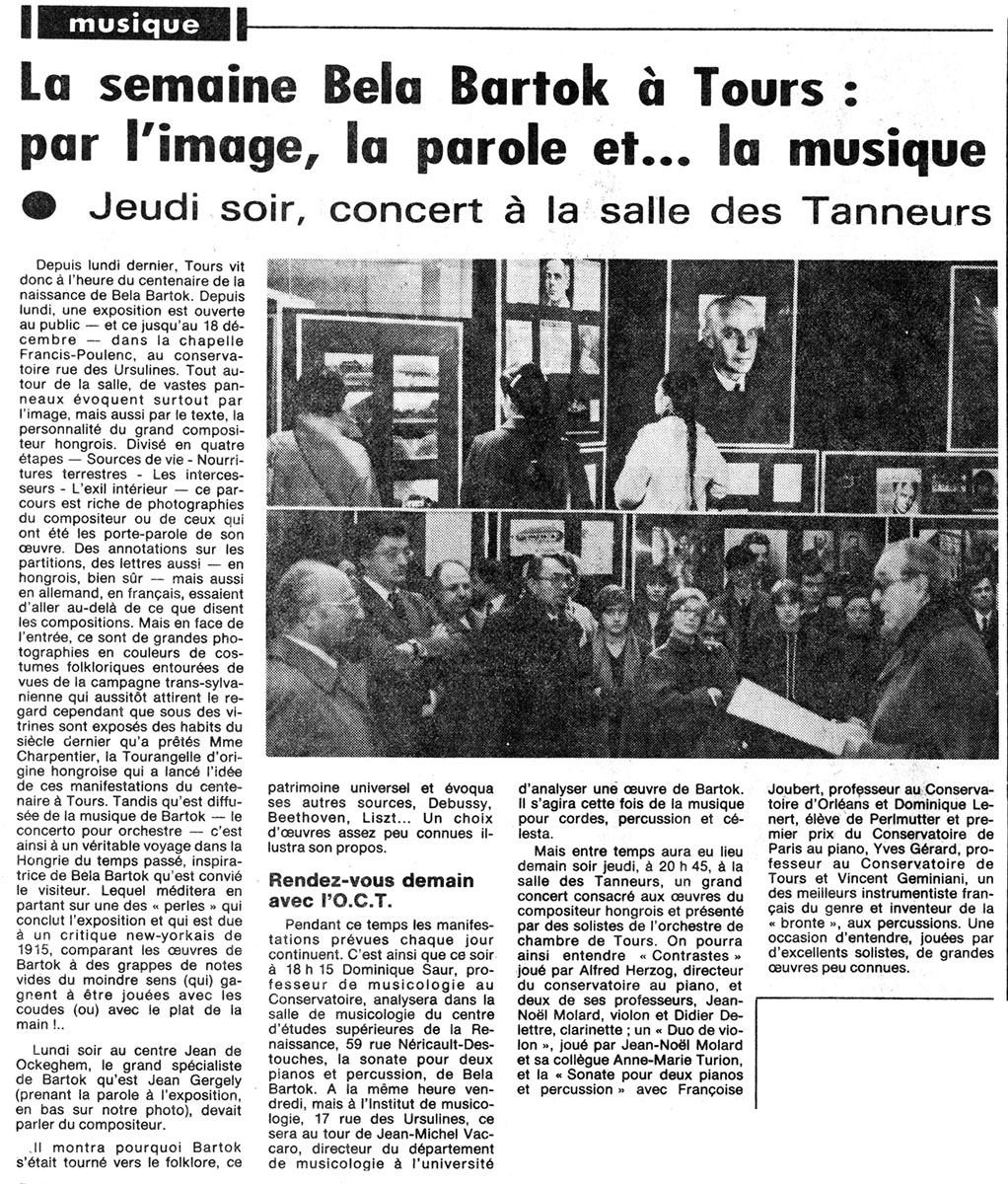 Un concert entièrement consacré à Béla Bartók est donné à Tours le 10 décembre 1981, dans le cadre du centenaire de sa naissance. Le programme comprend notamment la Sonate pour deux pianos et percussions et d’autres œuvres, interprétées par plusieurs musiciens français.