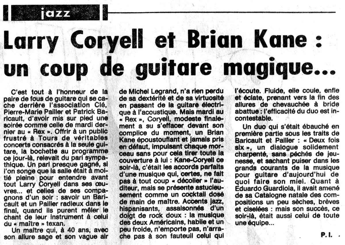 Le 27 avril 1982, Larry Coryell et Brian Kane se produisent au Rex à Tours, dans une soirée organisée par l’association Clé, animée par Pierre-Marie Pailler et Patrick Baricaut. Le duo livre un concert acoustique virtuose, salué pour sa fluidité et son intensité. En première partie, Pailler et Baricaut présentent « Deux fois six ».
