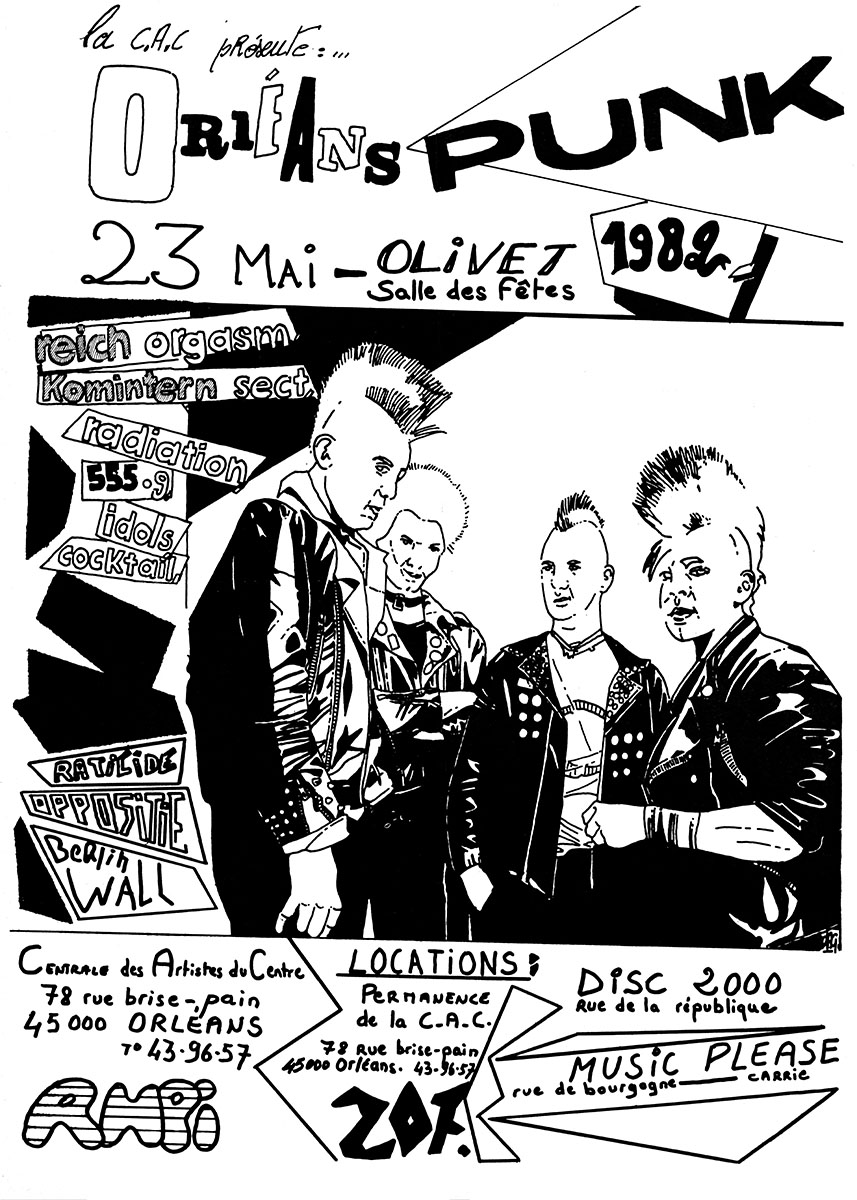 45, 555.9, berlin wall, idols, Kidnap, Komintern Sect, la centrale des artistes du centre, Raticide, Reich Orgasm, salle des fetes olivet « Orléans Punk » (23/05/82)